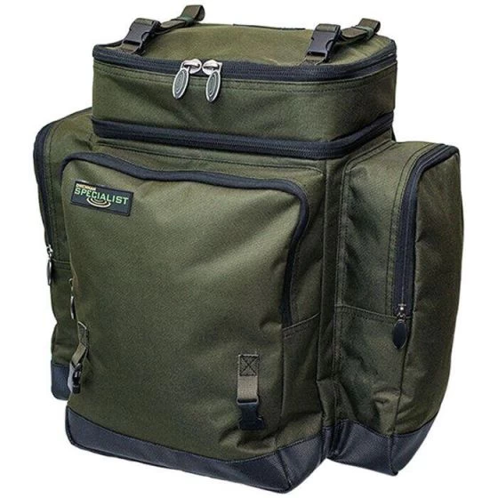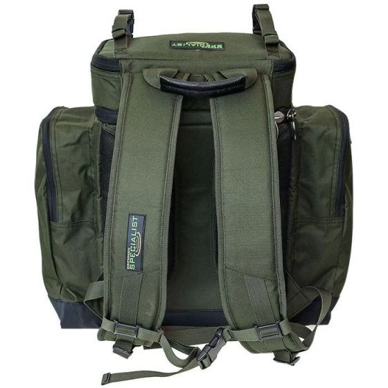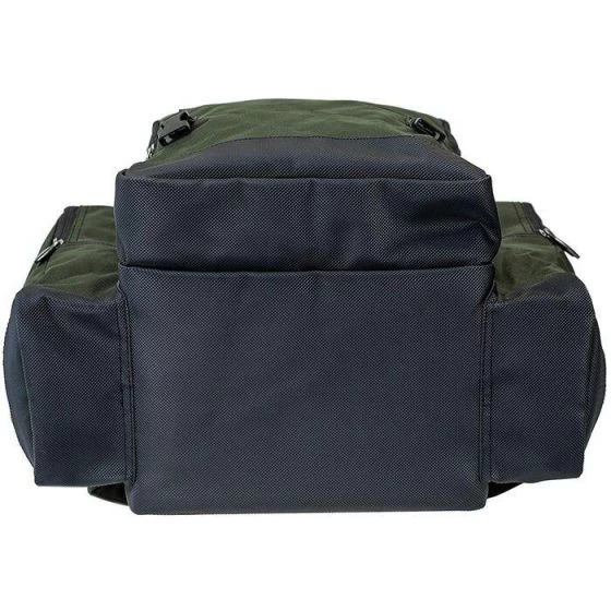 The rucksack is made from a tough and durable 600 denier fabric with a reinforced waterproof base. The bag has three external zipped pockets, along with a foil-lined top compartment which is ideal for storing bait and other items of tackle. The inside of the bag is padded and also has an internal clear zipped pocket on the bottom of the lid.