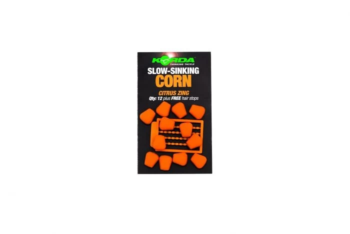 This Slow Sinking Corn is the perfect hook bait for fishing over particles, in solid bags or even on its own! Each grain has its flavour combination actually moulded into the plastic, rather than simply soaked in, which makes them quite different from other plastic products on the market. There are four flavour combinations available, IB, Banoffee, Citrus Zing and Fruity Squid. These are classic blends of flavours that the Korda team has been using for decades in some cases! Each variant is a different colour, so you’re sure to find one that suits your angling in the range. The buoyancy has been engineered so that the corn sinks ever so slowly, giving perfect presentation over light particles like natural corn, or groundbait and stick mix. You get 12 pieces of corn per pack and free matching hair stops too!