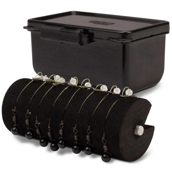 Dedicated box for chod rigs, stiff hinge hooking sections and all presentations with extended and curved shrink tube. Features an internal foam roller to tension and secure rigs to maintain the perfect curve in storage. Stores up to 15 rigs. Supplied with pins.